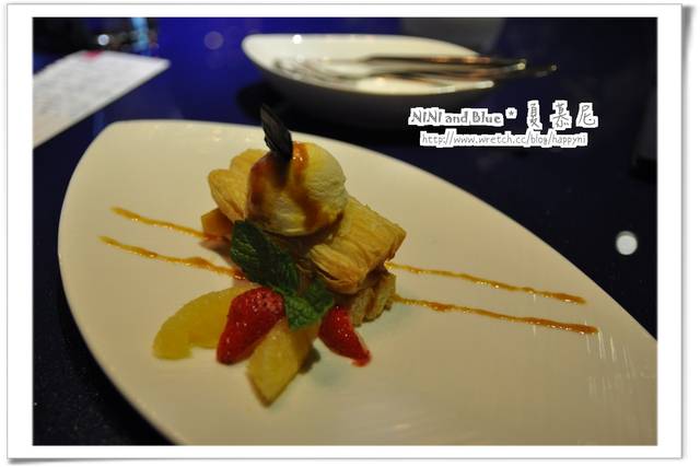 諾曼地蘋果派,上面一球是香草冰淇淋,搭派千層派,好吃ㄟ