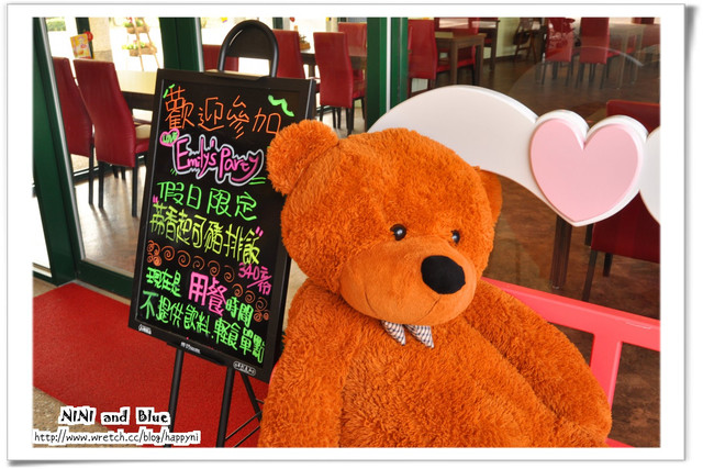 餐廳區門口擺放隻大熊很多人搶著跟他拍照ㄋ